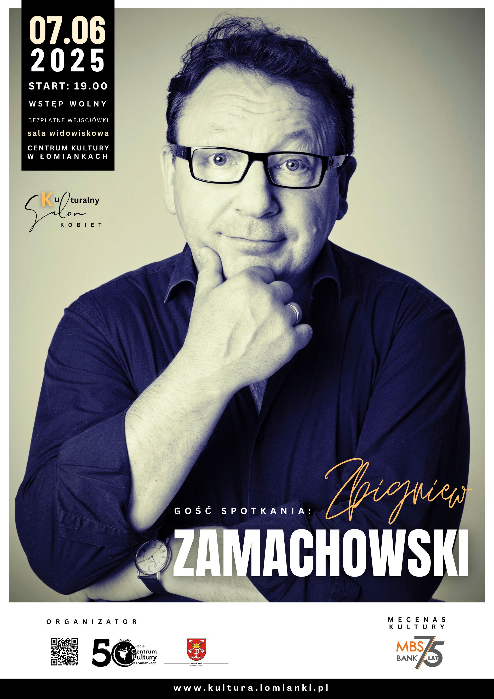 Centrum Kultury w Łomiankach serdecznie zaprasza na kolejne spotkanie w ramach cyklu "Kulturalny Salon Kobiet". Gościem i rozmówcą będzie Zbigniew Zamachowski – wybitny aktor teatralny i filmowy, autor tekstów, kompozytor, artysta wszechstronny, którego talent i charyzma od lat zachwycają zarówno widzów teatralnych, telewizyjnych, jak i kinowych.
