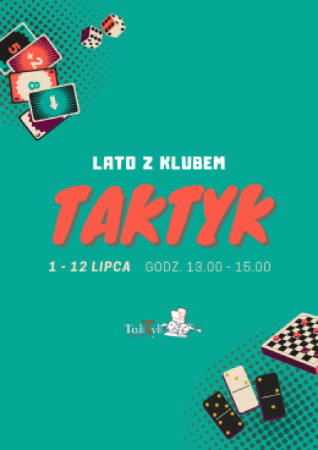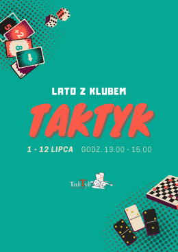 Istnieje możliwość przedłużenia zajęć „Letnich akcji na wakacje". Codziennie od 1 do 12 lipca w godz. 13.00-15.00 zapraszamy dzieci do Klubu Gier Planszowych „TAKTYK” na spędzenie fascynującego czasu wśród planszówek w ramach „Lata w Taktyku".