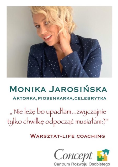 Warsztat / spotkanie z Moniką Jarosińską to jej historia…bardzo prawdziwa. Kryzys, depresja, radzenie sobie ze stresem. Artystka podzieli się z nami swoim doświadczeniem i wypracowanym działaniem w powyższym temacie. Większa część spotkania będzie miało charakter rozmowy otwartej z prowadzącą -aktywny udział uczestników w spotkaniu.To okazja do szczerej rozmowy z artystka w kameralnym klimacie przy dobrym ciastku i kawie bądź herbacie.