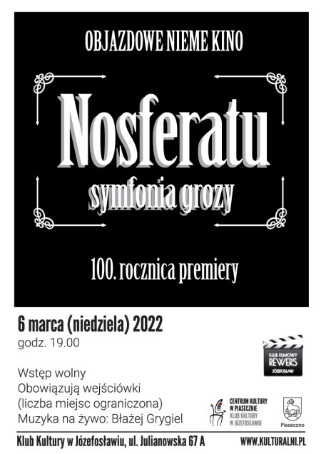 Wyjątkowy pokaz kina niemego z muzyką na żywo. Objazdowe Nieme Kino wraca do Józefosławia! Tym razem zamierzamy uczcić jubileusz setnych urodzin dzieła „Nosferatu – symfonia grozy”, które miało swoją premierę w 4 marca 1922 roku. Do filmu zagra Błażej Grygiel, muzyk związany z szeregiem projektów rockowych, nie stroniący także od folku i elektroniki.