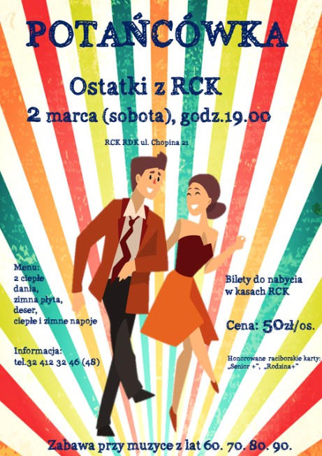 Serdecznie zapraszamy na OSTATKI Z RCK- potańcówkę karnawałową, która odbędzie się w sobotę 2 marca w części bankietowej na I piętrze. Zaczynamy o godzinie 19:00 i bawimy się do późnych godzin nocnych (do godz. 2:00) przy gorących rytmach lat: 60, 70, 80, i 90.
