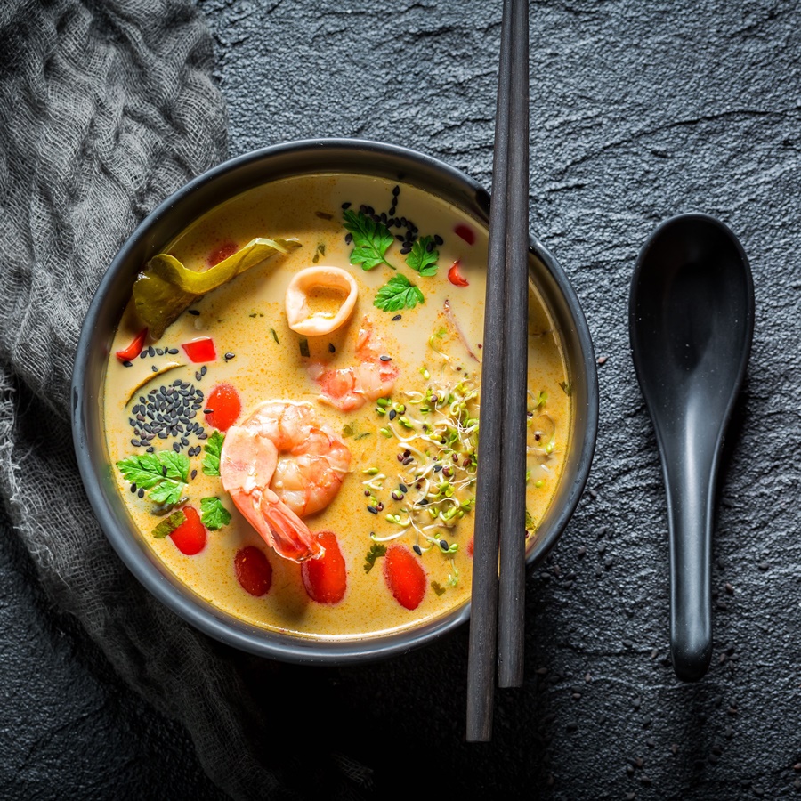 TOM YUM GOONG - kremowa, ostro – kwaśna zupa Tom-Yum to jeden z klasyków tajskiej kuchni. Połączenie ostrości papryczek chilli z kwaśną limonką tworzą niesamowity smak! Zupę podamy z krewetkami.