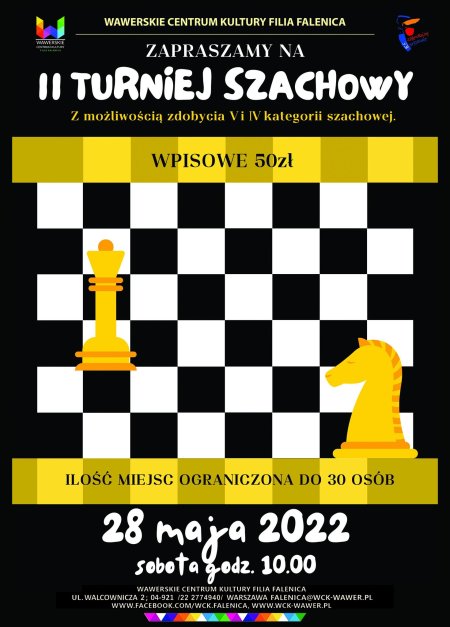 Zapraszamy na otwarty turniej szachowy do WCK Filii Falenica z możliwością zdobycia V kategorii szachowej.Obowiązują zapisy pod nr.telefonu 22/277 49 40 lub mailowo: [email protected]