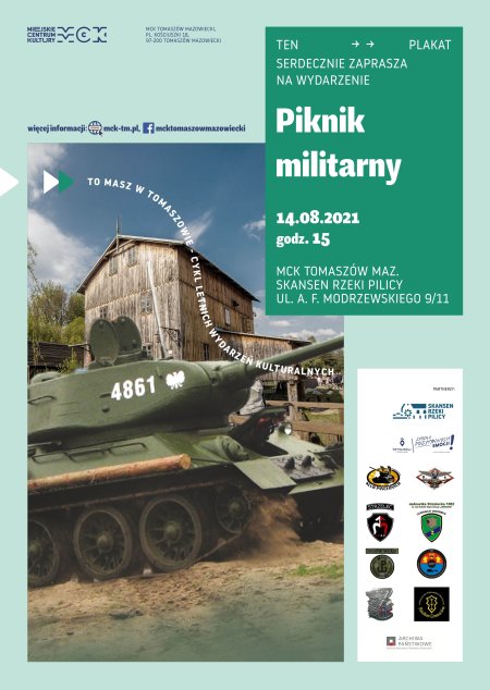 Militaria to nieodłączna część Skansenu Rzeki Pilicy. Cieszą się ogromnym zainteresowaniem zarówno tomaszowian, jak i turystów, więc i w tym roku nie mogło zabraknąć ,,Pikniku militarnego”. Coś dla siebie znajdą zarówno miłośnicy militariów współczesnych jak historycznych, zwłaszcza z okresów II Wojny Światowej. Dopełnieniem militarnego klimatu będą czynne pokazy, aranżacja żołnierskiego obozu czy kuchni polowej oraz występ na żywo wokalistów Miejskiego Centrum Kultury.