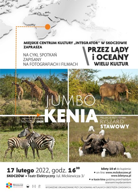 Miejskie Centrum Kultury "Integrator" w Skoczowie zaprasza na kolejną edycję cyklu prelekcji podróżniczych pod nazwą "Przez lądy i oceany wielu kultur". 17 lutego 2022 r. spotkanie z Ryszardem Stawowym zatytułowane "JUMBO KENIA".