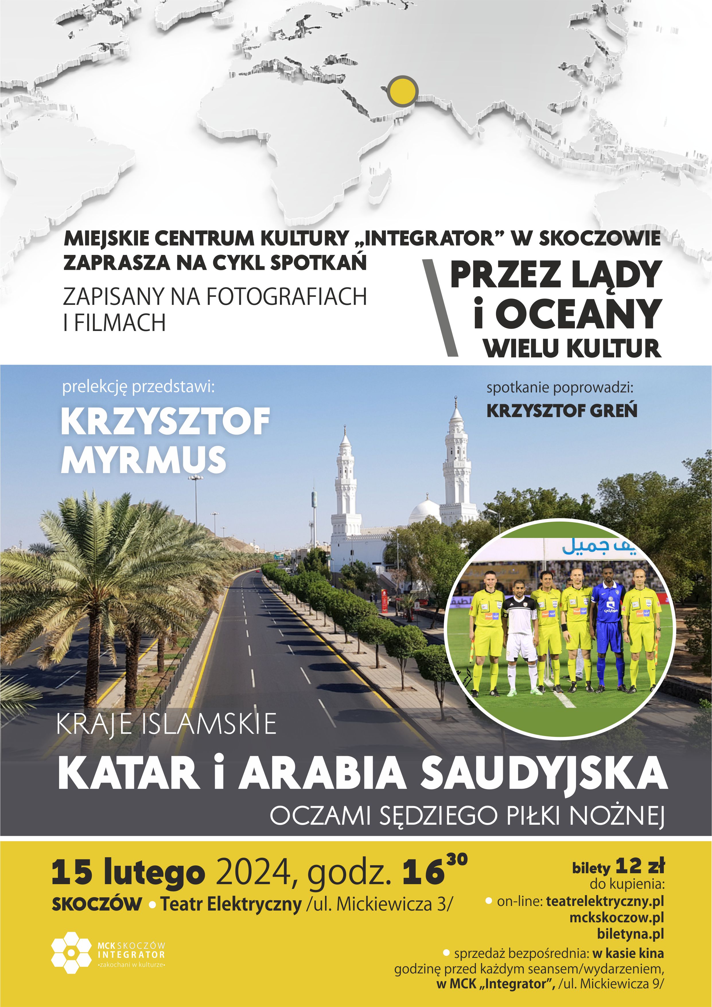 Miejskie Centrum Kultury "Integrator" zaprasza na kolejną prelekcję podróżniczą z cyklu "Przez lądy i oceany wielu kultur" pt. "KATAR I ARABIA SAUDYJSKA oczami sędziego piłkarskiego". O swojej wyprawie opowie Krzysztof Myrmus. Spotkanie poprowadzi Krzysztof Greń.