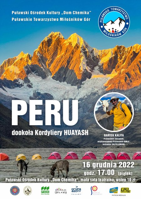 Bartek Kalita to przewodnik tatrzański, międzynarodowy przewodnik górski UIMLA oraz instruktor narciarstwa. W 2016 puławianin wspólnie z towarzyszami ówczesnej wyprawy, zdobył szczyt najwyższej góry Europy, czyli Mont Blanc. W „Domu Chemika” podróżnik przedstawi relację ze swojej wyprawy do Peru. Jeśli więc macie ochotę posłuchać i pooglądać zdjęcia Kordyliery Huayash, zapraszamy serdecznie!