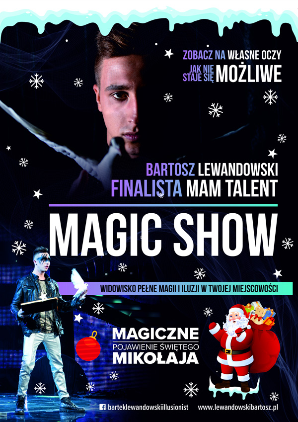 Zapraszamy na Świąteczne Magic Show w wykonaniu jednego z najlepszych iluzjonistów młodego pokolenia w Polsce - Bartosza Lewandowskiego, Finalisty programu Mam Talent!