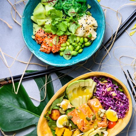 POKE BOWL - Ryż w zalewie sushi / łosoś w Teriyaki / awokado / Wakame z olejem sezamowym / pomidor koktajlowy / szczypiorek / sezam / pikantny sos słodko-kwaśny