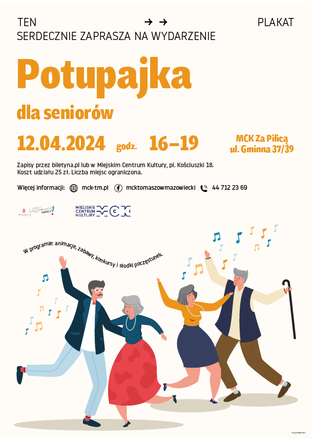 Potupajka dla seniorów -zabawa taneczna którą poprowadzi animatorka Katarzyna Wojtaszczyk. W programie planowane są animacje, zabawy i konkursy. Zachęcamy do tzw. koszyczkowego. W cenie biletu zapewniamy ciastka, kawę i herbatę.