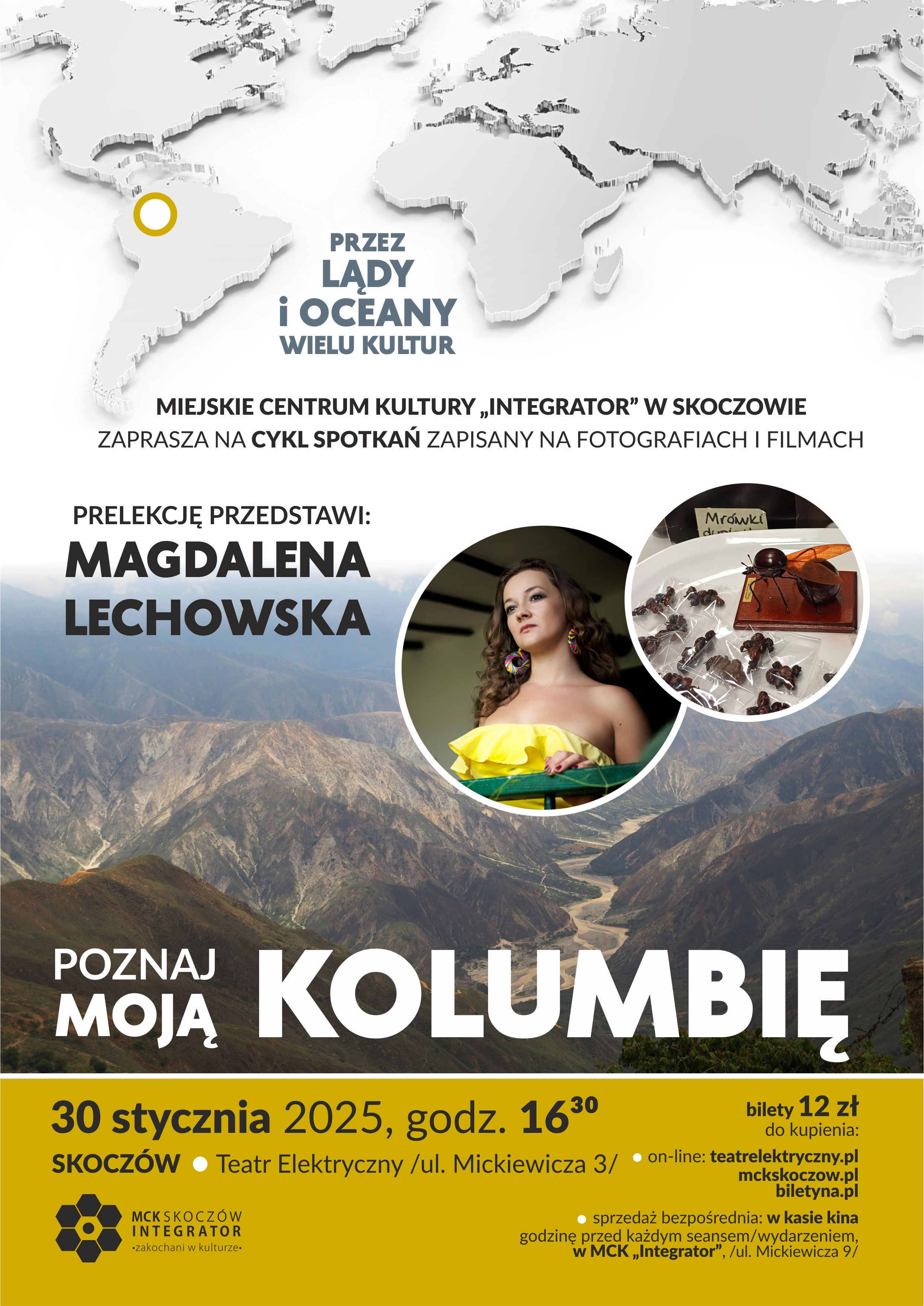 Miejskie Centrum Kultury "Integrator" w Skoczowie zaprasza na kolejną prelekcję podróżniczą z cyklu "Przez lądy i oceany wielu kultur". Tym razem spotkanie pod tytułem "Poznaj moją Kolumbię". Prelegentką będzie Magdalena Lechowska.