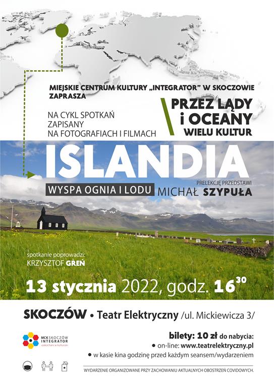 Miejskie Centrum Kultury "Integrator" w Skoczowie zaprasza na kolejną edycję cyklu prelekcji podróżniczych pod nazwą ""Przez lądy i oceany wielu kultur". 13 stycznia 2022 r. spotkanie z Michałem Szypułą zatytułowane "Islandia wyspa ognia i lodu"