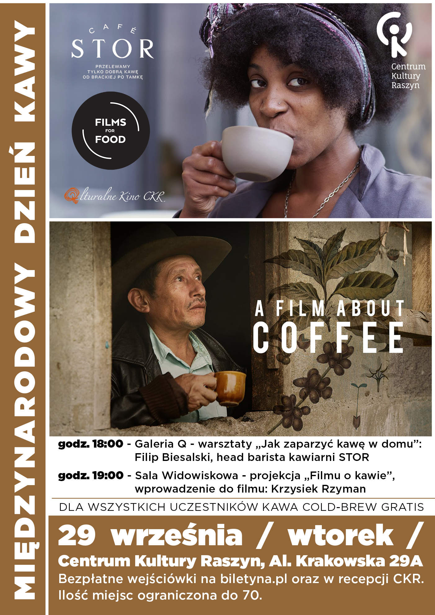 Projekcję filmu rozpocznie Krzysiek Rzyman, współautor przewodnika po kawiarniach specialty Coffee Spots Polska i właściciela kawiarni STOR, który opowie o tym jak wygląda podróż kawy od plantacji do naszego kubka oraz czym jest kawa specialty (godz. 19:00 / Sala Widowiskowa /).