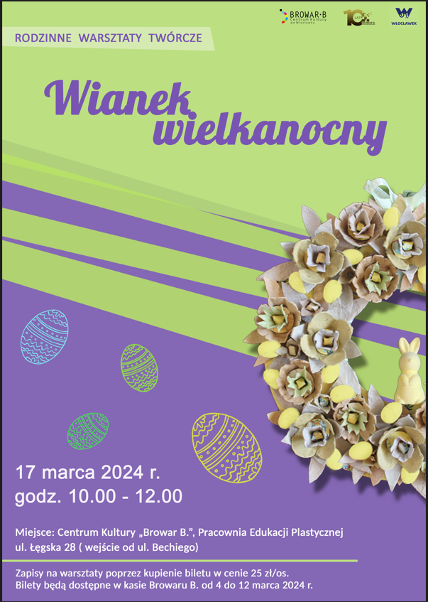 Rodzinne Warsztaty Twórcze poprowadzi Lilianna Skrzyńska. Odbędą się one 17 marca (niedziela), w godzinach 10.00-12.00, w Pracowni Edukacji Plastycznej (ul. Łęgska 28, wejście od ul. Bechiego). Zapisy na warsztaty możliwe są poprzez kupienie biletu w cenie 25 zł/os. Dostępne one będą w kasie Browaru B. od 4 do 12 marca 2024. Więcej informacji uzyskać można pod numerem telefonu: 54 427 02 47.