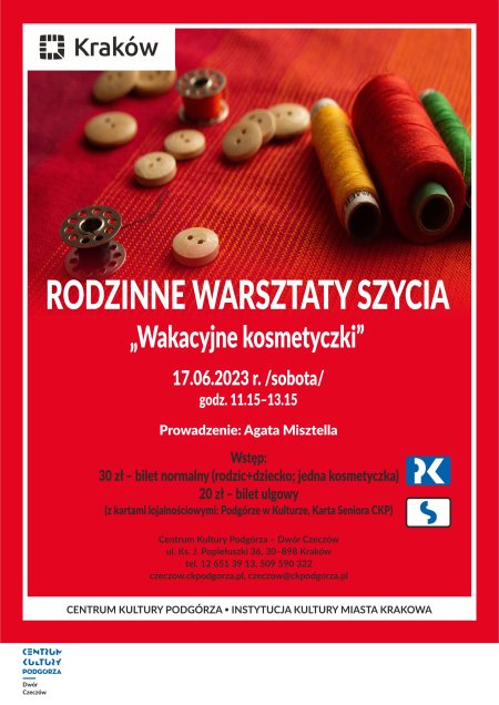 Zapraszamy na rodzinne warsztaty szycia, które odbędą się w sobotę 17 czerwca 2023 o godz. 11.15 w Dworze Czeczów.