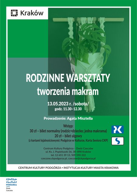 Jeden bilet uprawnia do uczestnictwa w warsztatach dziecka wraz z opiekunem, jeśli wykonywać będą jeden zestaw (jeden bilet to jedna makrama). Limit uczestników na zajęciach – 10 makram.