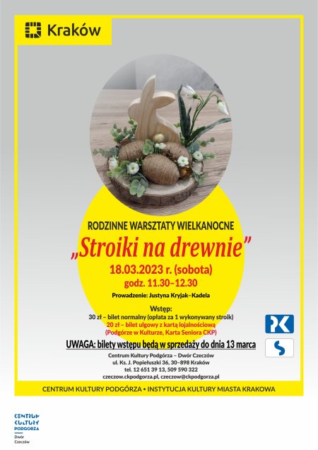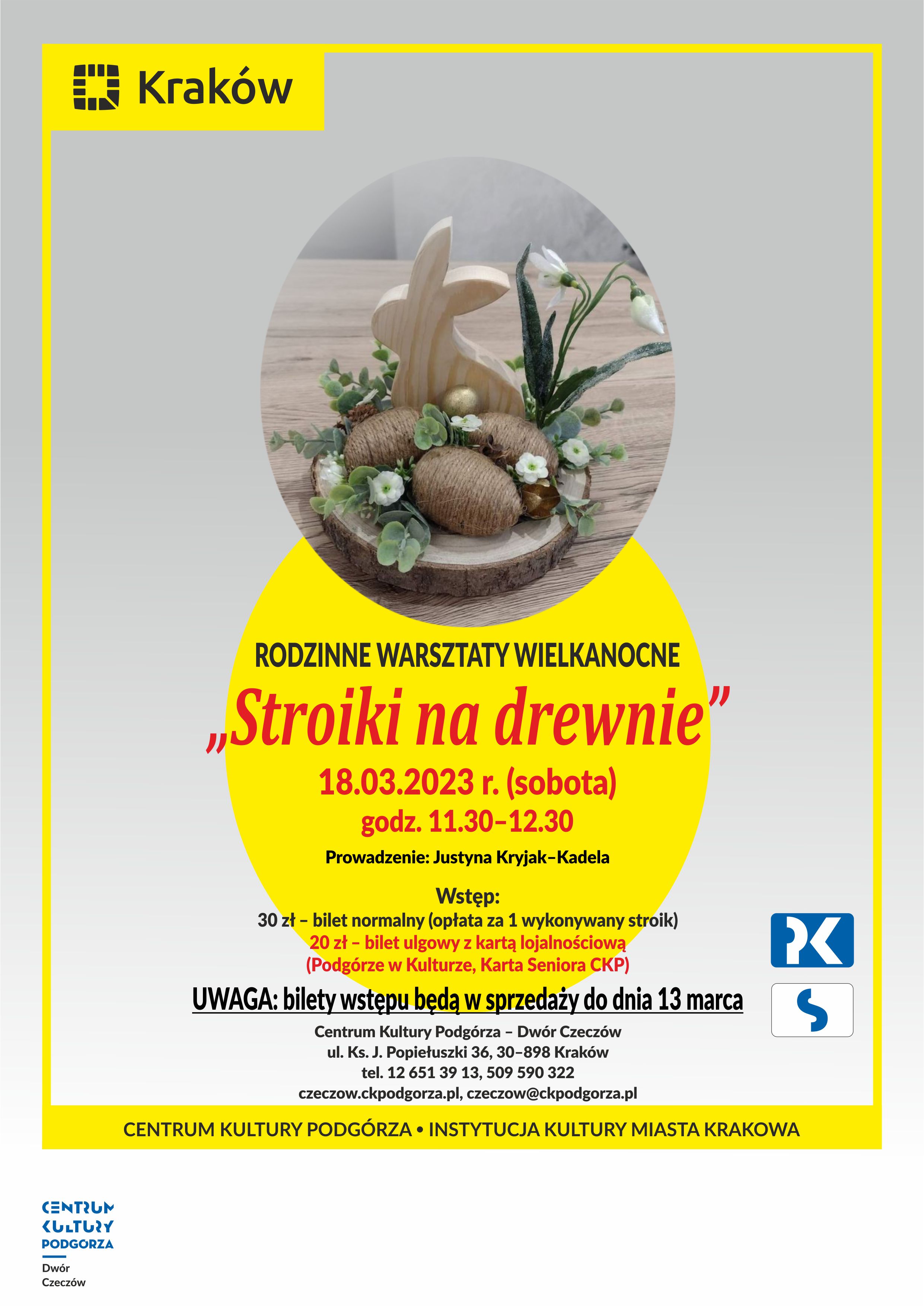Podczas warsztatów uczestnicy pod okiem prowadzącej stworzą unikatowe dekoracje na plastrze drewna, z wykorzystaniem materiałów oraz akcesoriów niezbędnych w okresie Wielkanocy takich jak kurczęta, jajeczka itd. jeden bilet uprawnia do uczestnictwa w warsztatach dziecka wraz z opiekunem, jeśli wykonywać będą jeden stroik (jeden bilet to jeden wykonany stroik). Zajęcia trwają od 11.30 do 12.30.