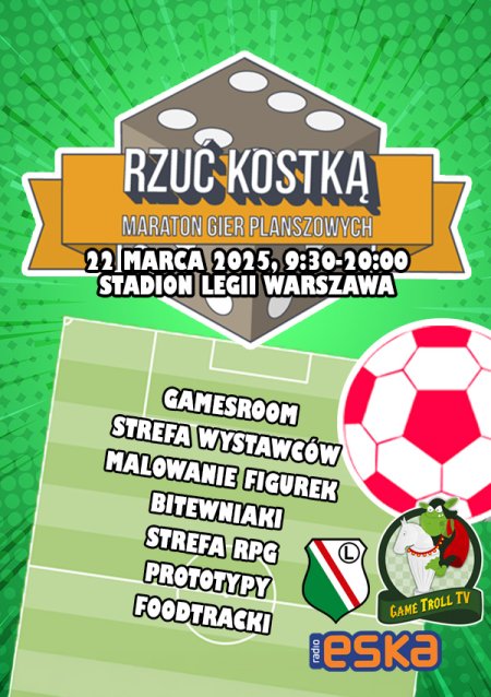 Od 18 lat "Rzuć Kostką", to spotkanie fanów gier planszowych, które odbywa się w Warszawie. Pora na kolejny krok i wprowadzenie tego wydarzenia na wielką przestrzeń stadionu Legii Warszawa. Na dwóch piętrach czeka Was wiele atrakcji. Wydawcy, którzy zaprezentują na stoiskach nowe i starsze tytuły, wypożyczalnia, gralnia, gry bitewne i prototypy. Przed wejściem na wydarzenie będziecie mogli wziąć udział w festiwalu food trucków! Zapraszamy