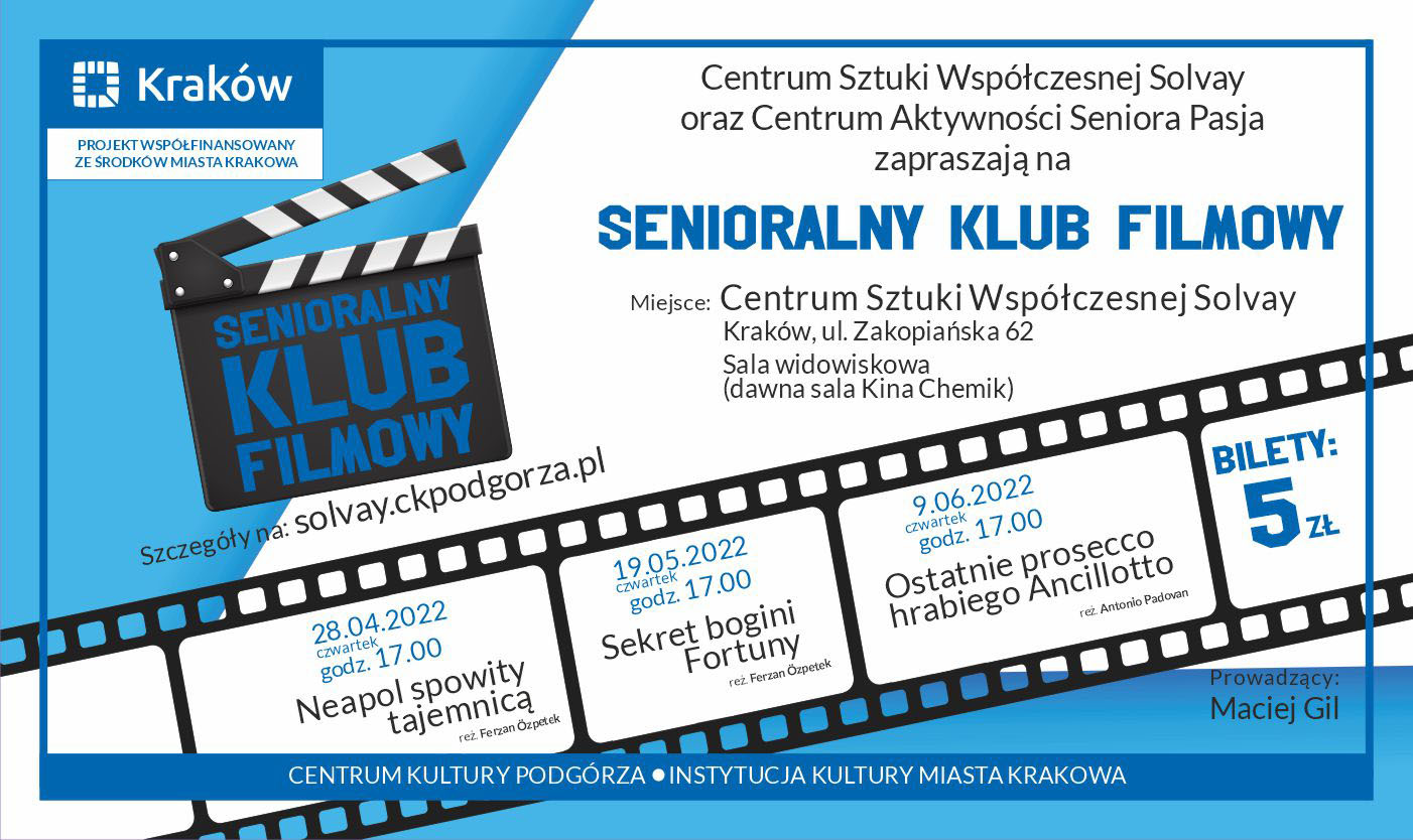 SENIORALNY KLUB FILMOWY CSW SOLVAY & CAS PASJA. Co miesiąc zapraszamy na spotkanie z najlepszymi dziełami sztuki filmowej. Po inauguracyjnych spotkaniach z kinem Czechów i Słowaków, oraz filmowej wyprawie na najdalszą północ Europy-Skandynawię, w III edycji projektu wybierzemy się na filmową wycieczkę na południe Europy, do słonecznej (a niekiedy i mrocznej) Italii. Projekcje poprzedzone będą prelekcją Macieja Gila, animatora kultury filmowej, działacza ruchu klubowego, dziennikarza, prelegenta i edukatora, na co dzień związanego z krakowską Fundacją Wspierania Kultury Filmowej Cyrk Edison.