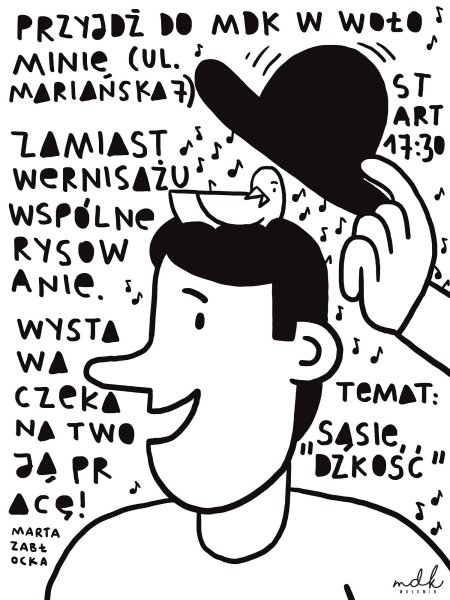 Postanowiliśmy tym razem zrezygnować z wernisażu, w jego miejsce odbędą się warsztaty rysunku na które zapraszamy wszystkich, niezależnie od tego czy ktoś posiada zdolności plastyczne