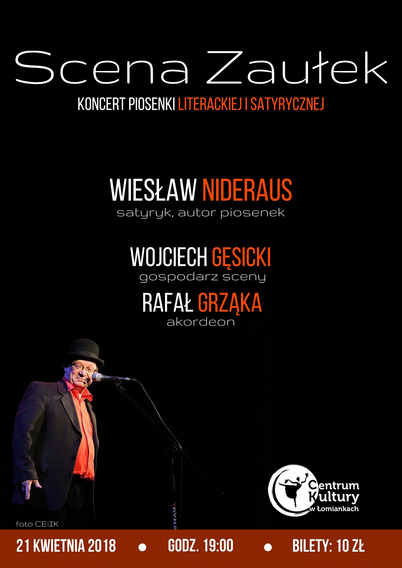 WIESŁAW NIDERAUS – satyryk, prześmiewca, autor piosenek, konferansjer. Współpracuje z Krzysztofem Daukszewiczem, Czerwonym Tulipanem, od lat jest gospodarzem Sceny Kabaretowej TRÓJKI Polskiego Radia w Szczytnie „Scena 9”, a także w Olsztynie w Hotelu Wileńskim. Ma na swoim koncie nagrania telewizyjne (HBO;TVN; TVP).