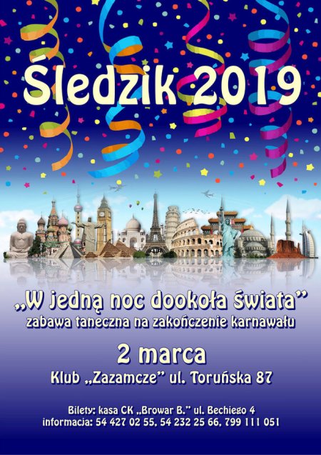 Klub „Zazamcze” CK „Browar B.” zaprasza w ostatnią sobotę karnawału 2 marca na zabawę taneczną – tradycyjnego śledzika. W tym roku mile widziane będą stroje związane z tematem imprezy. Zaproszenia w cenie 120 zł/osoba do nabycia od 28 stycznia br. w kasie Centrum Kultury „Browar B.” wejście od ul Bechiego 4; w dniach: pon. - pt. godz. 10.00-18.00 i sob. 14.00-18.00. Rezerwacji biletów na imprezę nie prowadzimy.