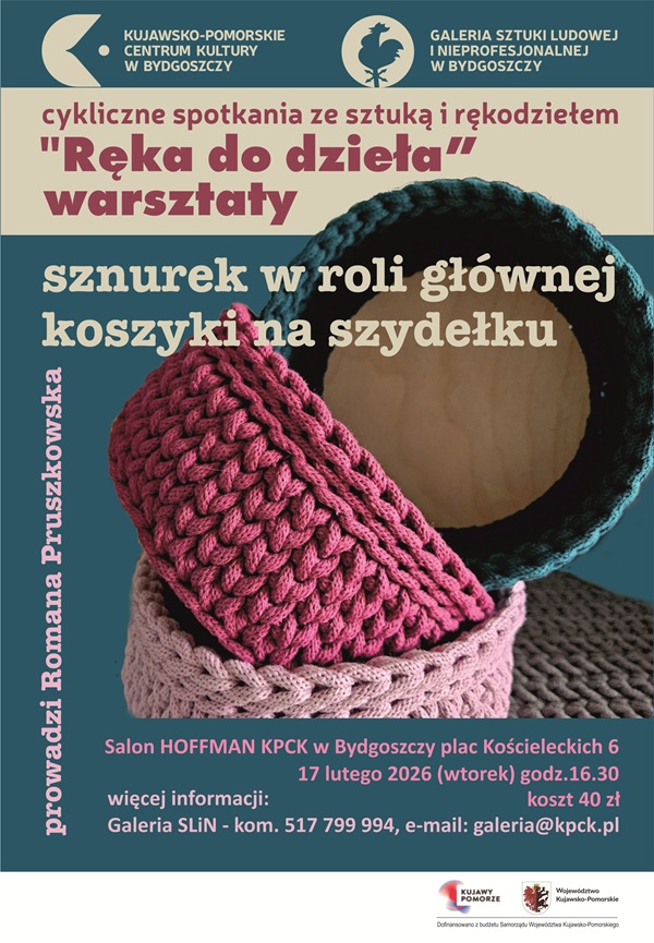 Zapraszamy na kolejne warsztaty z cyklu „Ręka do dzieła”, tym razem sięgniemy po sznurek i szydełko! Podczas spotkania uczestnicy wspólnie wykonają własne małe, praktyczne koszyki ze sznurka – prostą, funkcjonalną formę, która sprawdzi się w domu, zarówno jak i jako element dekoracyjny i praktyczny. Warsztaty poprowadzi Romana Pruszkowska – pasjonatka rękodzieła, mama i pedagog. Doświadczona w prowadzeniu warsztatów, z łatwością nawiązuje kontakt z uczestnikami i dba o dobrą, sprzyjającą twórczej pracy atmosferę. Zajęcia są skierowane do dorosłych. Szczegółowy regulamin warsztatów dostępny jest na stronie kpck.pl.