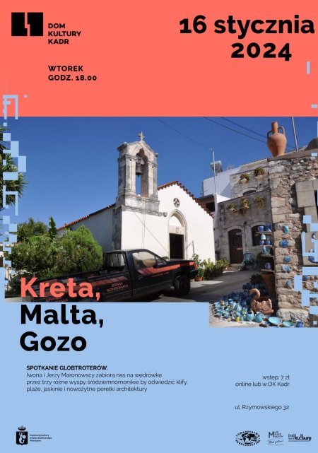 Zapraszamy na wędrówkę przez jakże różne wyspy śródziemnomorskie. Letnia Kreta, zimowa Malta i bajkowe Gozo. Opowiemy jak na tych niewielkich wyspach w miesiąc przejechać 3000 km wynajętym samochodem, wspiąć się na najwyższe szczyty, odwiedzić dziesiątki muzeów, klify, plaże, jaskinie i resztki pozostawionych przez różne cywilizacje budowli od świątyń megalitycznych, przez starożytne miasta po średniowieczne i nowożytne perełki architektury.