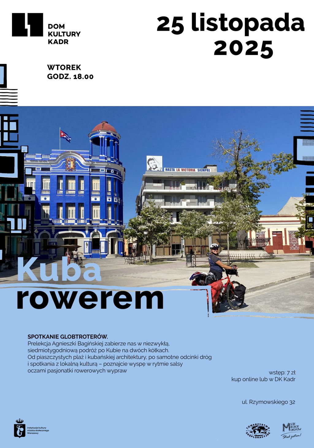 Siedem tygodni, setki kilometrów i jedna wyspa pełna kontrastów. Podróżniczka Agnieszka Bagińska opowie o swojej niezwykłej wyprawie rowerowej po Kubie – kraju salsy, cygar, pięknych plaż i codziennych trudów życia.