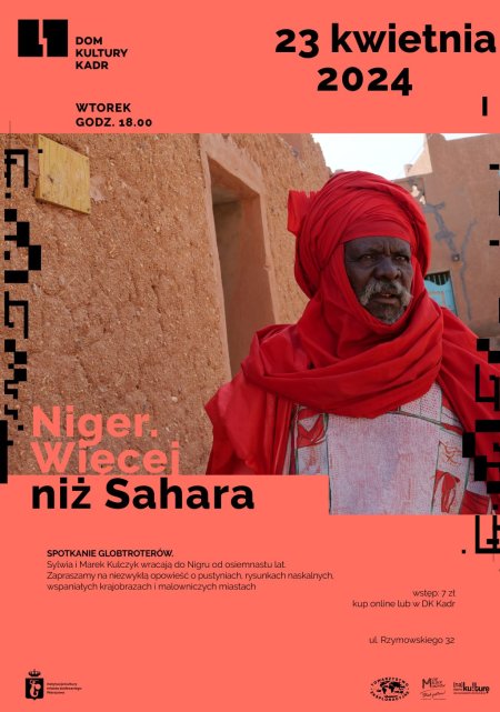 Jeśli w ogóle słyszymy o Nigrze, to przy okazji zamachu stanu, klęski głodu czy migracji. Wszystko to prawda, która jednak nie mówi nam o tym kraju nic. Nie wspomina o pięknie pustyni, rysunkach naskalnych, wspaniałych krajobrazach i malowniczych miastach. Ani o tym, co się liczy najbardziej: tradycji oraz rytmie codziennego życia. Sylwia i Marek Kulczyk wracają do Nigru od osiemnastu lat. Mogliby powiedzieć, że znają tę część Sahelu jak własną kieszeń, ale ciągle coś ich zaskakuje. Właśnie tymi zaskoczeniami chcą się z Państwem podzielić.