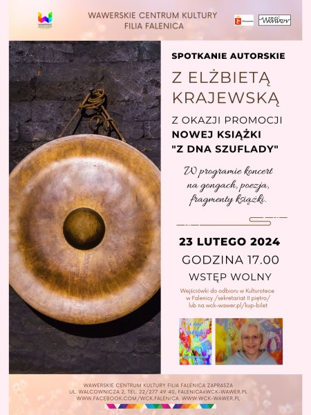Serdecznie zapraszamy na wieczór autorski Elżbiety Krajewskiej z okazji promocji książki "Z dna szuflady" w programie koncert na gongach, poezja, fragmenty książki.