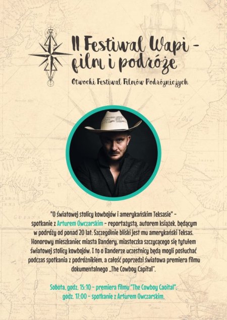 "O światowej stolicy kowbojów i amerykańskim Teksasie" - spotkanie z Arturem Owczarskim - reportażystą, autorem książek, będącym w podróży od ponad 20 lat. Szczególnie bliski jest mu amerykański Teksas. Honorowy mieszkaniec miasta Bandery, miasteczka szczycącego się tytułem światowej stolicy kowbojów. I to o Banderze uczestnicy będą mogli posłuchać podczas spotkania z podróżnikiem, a całość poprzedzi światowa premiera filmu dokumentalnego „The Cowboy Capital”.