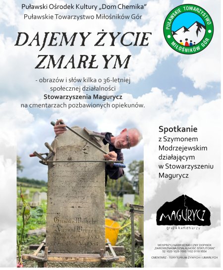 POK „Dom Chemika” i Puławskie Towarzystwo Miłośników Gór zapraszają na prelekcję pt. "Dajemy życie zmarłym” – obrazów i słów kilka o 36-letniej społecznej działalności Stowarzyszenia Magurycz na cmentarzach pozbawionych opiekunów.