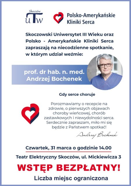 Co zrobić, gdy serce choruje? Dowiemy się już w najbliższy czwartek! Skoczowski Uniwersytet III Wieku oraz Polsko-Amerykańskie Kliniki Serca zapraszają na niecodzienne spotkanie z prof. dr hab. n. med. Andrzejem Bochenkiem!