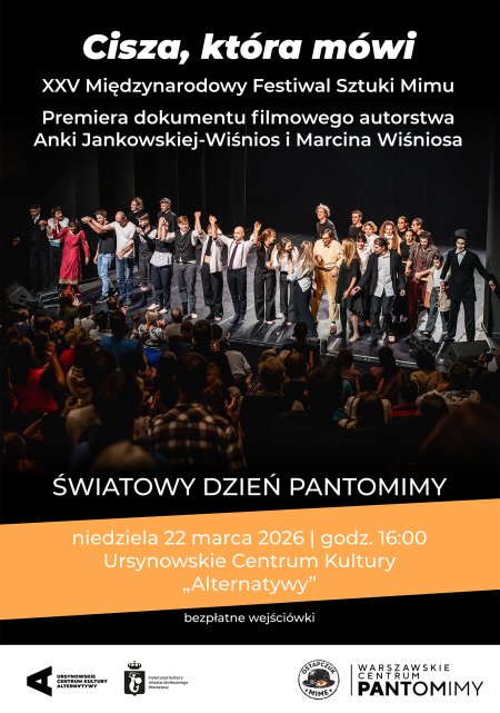 Fundacja Warszawskiego Centrum Pantomimy zaprasza na wyjątkowe spotkanie z okazji Światowego Dnia Pantomimy. W programie wieczoru znajdzie się premiera filmu „Cisza, która mówi. 25. Międzynarodowy Festiwal Sztuki Mimu”, dokumentującego jubileuszową edycję festiwalu, która odbyła się jesienią ubiegłego roku w Ursynowskim Centrum Kultury „Alternatywy”. Projekcja filmu będzie okazją do powrotu do najciekawszych momentów festiwalu, spotkań z artystami oraz atmosfery jednego z najważniejszych wydarzeń poświęconych sztuce teatru poza słowami. Pokaz poprzedzi rozmowa z realizatorami filmu – twórcami grupy Hultaj Film: Anką Jankowską-Wiśnios i Marcinem Wiśniosem. Spotkanie poprowadzi Bartłomiej Ostapczuk. Międzynarodowy Festiwal Sztuki Mimu to coroczne wydarzenie teatralne prezentujące sztukę pantomimy w jej najróżniejszych odsłonach. To święto teatru poza słowami, które od lat przyciąga do Warszawy artystów i widzów z wielu miejsc świata. Festiwal jest przestrzenią spotkań, warsztatów i wymiany doświadczeń między twórcami oraz publicznością. U jego podstaw leży różnorodność myślenia o sztuce pantomimy oraz spotkanie odmiennych tradycji i szkół teatralnych. Warszawski Międzynarodowy Festiwal Sztuki Mimu jest jednym z najbardziej rozpoznawalnych wydarzeń tego typu na świecie oraz jednym z najstarszych festiwali poświęconych tej sztuce.