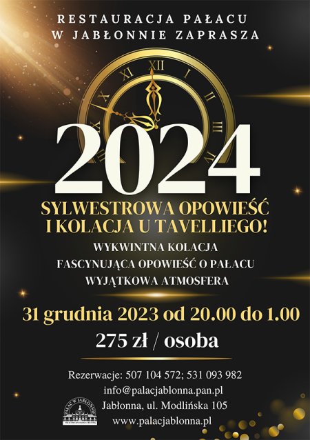SYLWESTROWA OPOWIEŚĆ I KOLACJA U TAVELLIEGO W RESTAURACJI PAŁACU W JABŁONNIE