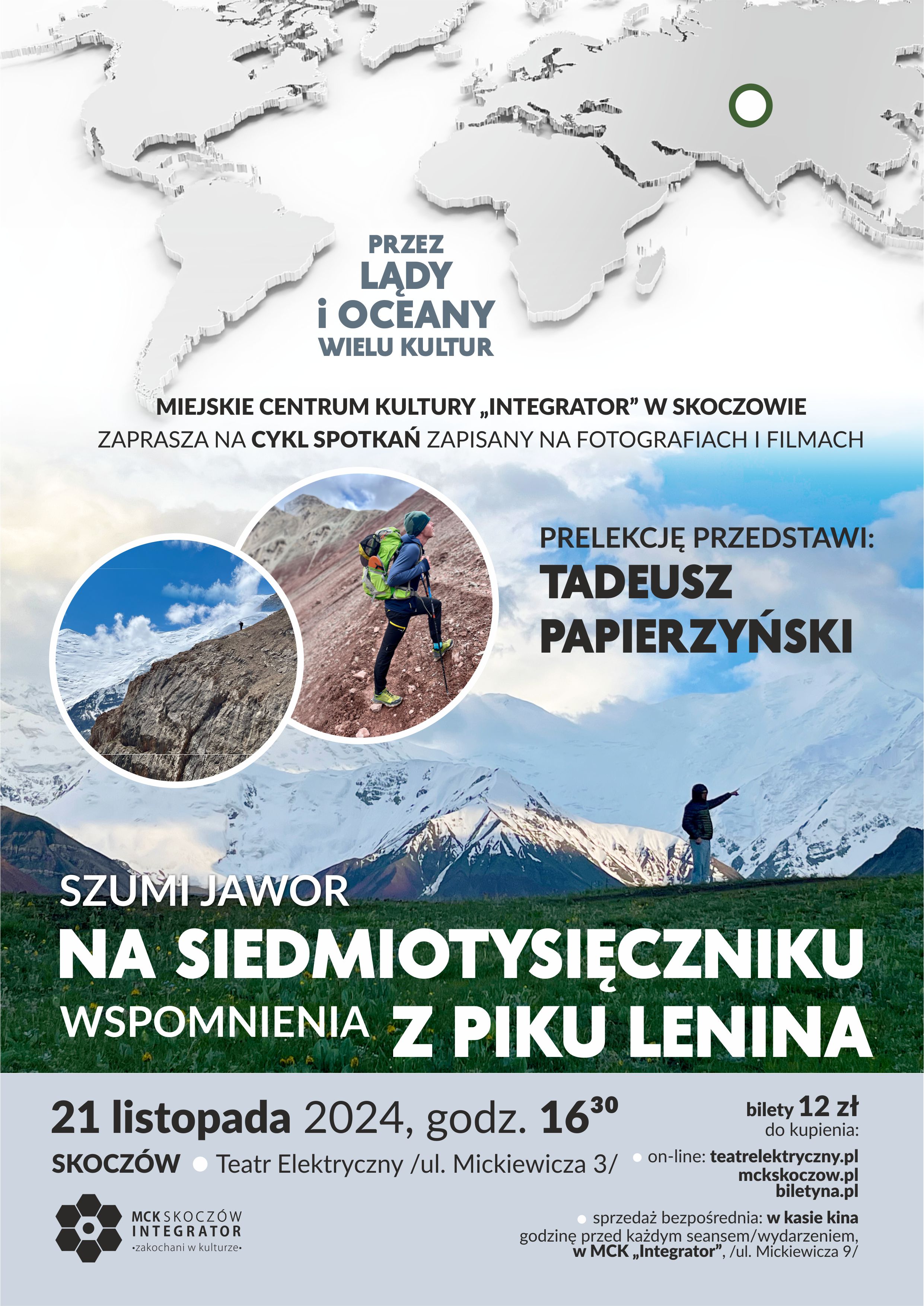 Miejskie Centrum Kultury "Integrator" w Skoczowie zaprasza na spotkanie pod nazwą "Szumi jawor na siedmiotysięczniku. Wspomnienia z Piku Lenina: Tadeusz Papierzyński", które odbędzie się w Teatrze Elektrycznym w Skoczowie 21 listopada o godz. 16.30 w ramach cyklu Przez lądy i oceany wielu kultur.
