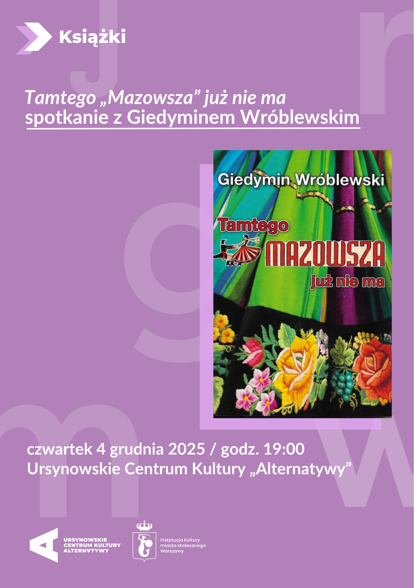 Rozmowa poświęcona książce Giedymina Wróblewskiego, aktora, reżysera, choreografa i wieloletniego tancerza „Mazowsza”. Publikacja stanowi bogato ilustrowane opracowanie o wymiarze naukowym, pełne osobistych refleksji autora i faktów z historii zespołu. Ukazuje transformację artystyczną „Mazowsza” od czasów powstania i w okresie kierowania przez Mirę Zimińską-Sygietyńską, będąc jednocześnie świadectwem pamięci o ludziach, którzy tworzyli to wyjątkowe zjawisko artystyczne i narodowe.