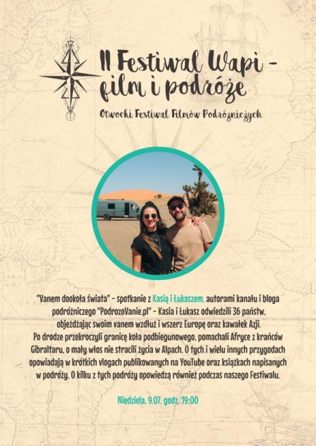 "Vanem dookoła świata" - spotkanie z Kasią i Łukaszem, autorami kanału i bloga podróżniczego "PodrozoVanie.pl" - Kasia i Łukasz odwiedzili 36 państw, objeżdżając swoim vanem wzdłuż i wszerz Europę oraz kawałek Azji. Po drodze przekroczyli granicę koła podbiegunowego, pomachali Afryce z krańców Gibraltaru, o mały włos nie stracili życia w Alpach. O tych i wielu innych przygodach opowiadają w krótkich vlogach publikowanych na YouTube oraz książkach napisanych w podróży. O kilku z tych podróży opowiedzą również podczas naszego Festiwalu.