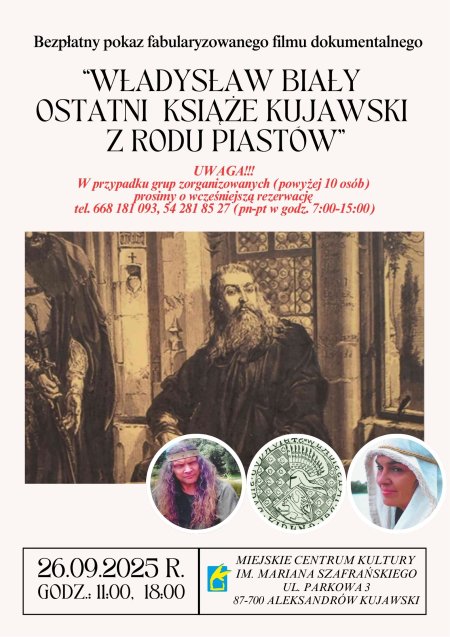 “WŁADYSŁAW BIAŁY - OSTATNI KSIĄŻE KUJAWSKI Z RODU PIASTÓW” Bezpłatny pokaz fabularyzowanego filmu dokumentalnego | Aleksandrów Kujawski