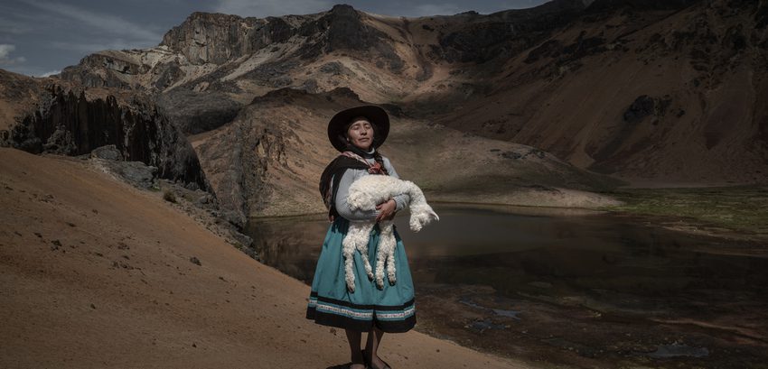 Alina Surquislla Gomez, „alpakerka” trzeciej generacji (hodowca alpak) kołysze małą alpakę w drodze na rodzinne pastwiska w Oropesa, w Peru. Kryzys klimatyczny zmusza pasterzy, z których wiele to kobiety, aby szukać nowych pastwisk, często w trudnym terenie.