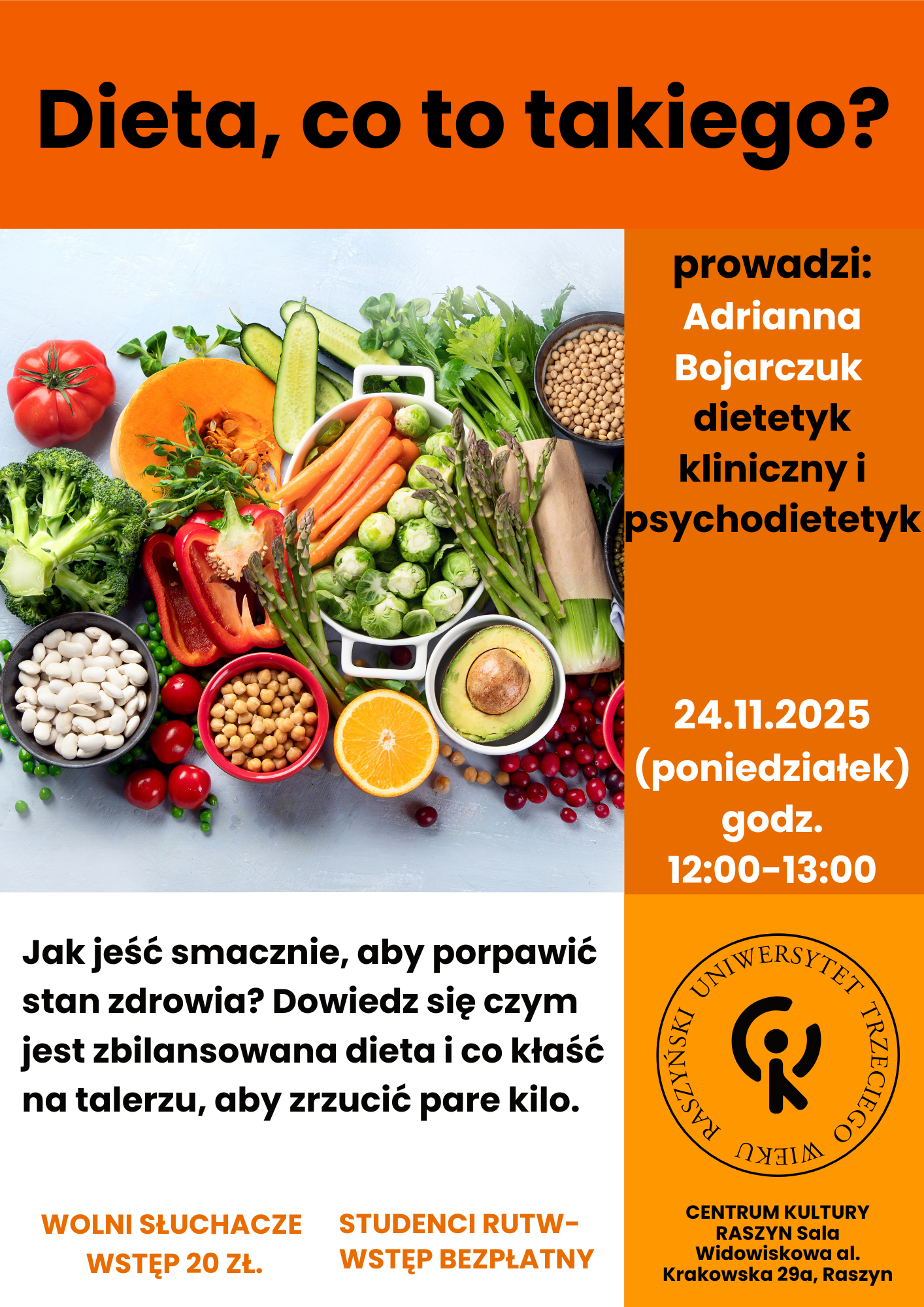 WYKŁAD RUTW: DIETA SENIORA temat: Dieta, co to takiego? Prowadzi Adrianna Bojarczuk: dietetyk kliniczny i psychodietetyk, absolwentką Uniwersytetu Medycznego w Łodzi oraz SGGW w Warszawie, studia doktoranckie w Instytucie Biotechnologii Przemysłu Rolno - Spożywczego w Warszawie uzyskując tytuł doktora. W pracy stawia przede wszystkim na trwałą zmianę nawyków żywieniowych, pokazuje jak jeść smacznie i zdrowo, aby poprawić swój stan zdrowia i wygląd sylwetki. CKR: Sala widowiskowa