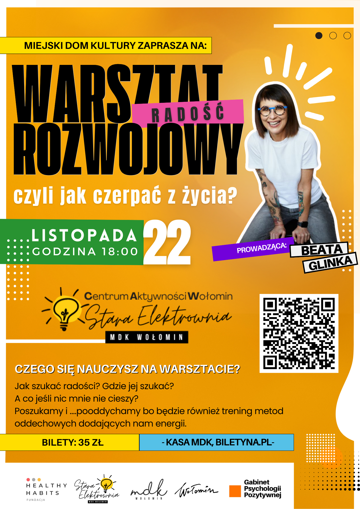 Miejski Dom Kultury w Wołominie i CAW - Stara Elektrownia zaprasza na wyjątkowy warsztat rozwojowy z BEATĄ GLINKĄ, pt. „Jak czerpać z życia?”, który odbędzie się już 22 listopada o godz. 18:00 w klimatycznej Starej Elektrowni!