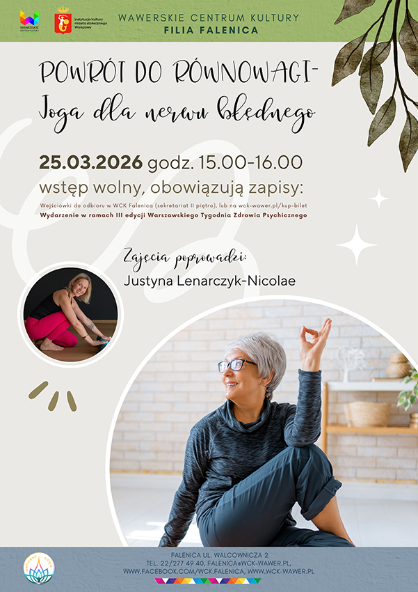 W ramach III Edycji Warszawskiego Tygodnia Zdrowia Psychicznego serdecznie zapraszamy na warsztaty "Joga dla nerwu błędnego - powrót do równowagi" w WCK Falenica. Warsztaty poprowadzi Justyna Lenarczyk-Nicolae.