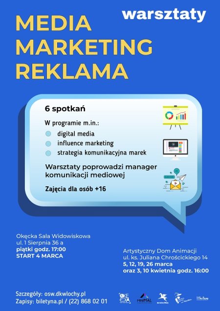 Cykl warsztatów, których celem jest ogólne zarysowanie mechaniki działania kampanii reklamowych oraz zainteresowanie uczestników tematyką mediów jako części kultury, zaprezentowanie najciekawszych case’ów reklamowych oraz praca warsztatowa z konkretnymi zadaniami.