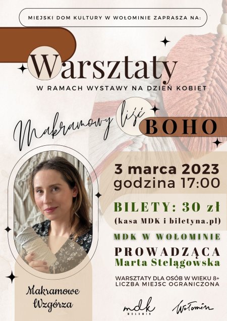 Serdecznie zapraszamy na warsztaty makramy " Makramowy liść BOHO", które odbędą się 3 marca 2023 o godz. 17.00 w Galerii Oranżeria MDK. Warsztaty odbędą się w ramach wystawy przygotowywanej na Dzień Kobiet.
