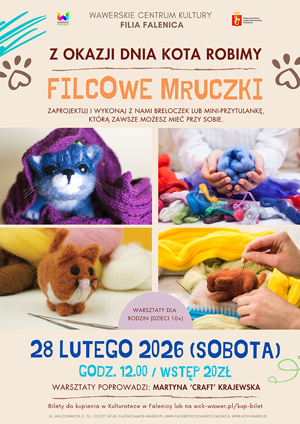 Z okazji Dnia Kota zapraszamy na rodzinne warsztaty filcowania pt: "Filcowe mruczki". Podczas spotkania zaprojektujemy i wykonamy breloczek lub mini - przytulankę, którą zawsze możesz mieć przy sobie. Warsztaty poprowadzi super instruktorka Martyna "Craft" Krajewska.