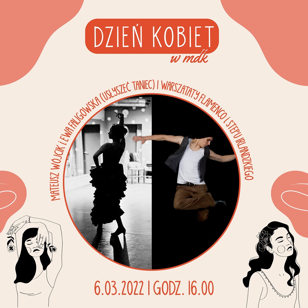 Z okazji Międzynarodowego Dnia Kobiet zapraszamy na warsztaty flamenco i stepu irlandzkiego (dla początkujących). Warsztaty odbędą się 6 marca 2022 r. w godzinach 16.00 - 18.00. Poprowadzą je tancerze z projektu Usłyszeć Taniec - Ewa Jakubiec i Mateusz Wójcik.