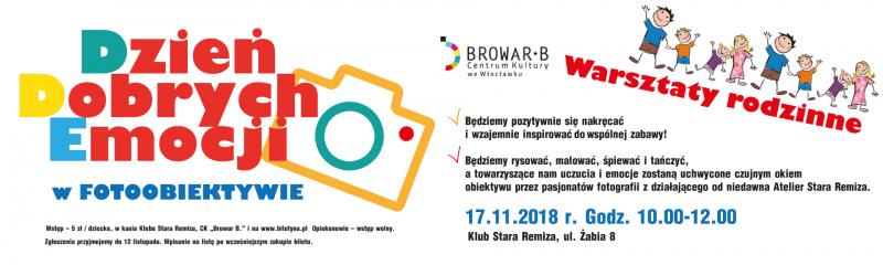 Klub „Stara Remiza” zaprasza dzieci, rodziców i dziadków na Dzień Dobrych Emocji w gościnnych murach swojej placówki! Będziemy pozytywnie się nakręcać i wzajemnie inspirować do wspólnej zabawy! Będziemy rysować, malować, śpiewać i tańczyć, a towarzyszące nam uczucia i emocje zostaną uchwycone czujnym okiem obiektywu przez pasjonatów fotografii z działającego od niedawna Atelier Stara Remiza. Wstęp – 5 zł /dziecko w kasie Klubu Stara Remiza, CK Browar B” i na www.biletyna.pl Opiekunowie – wstęp wolny. Zgłoszenia przyjmujemy do 12 listopada. Wpisanie na listę po wcześniejszym zakupie biletu.