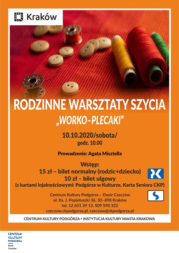 Zapraszamy serdecznie na warsztaty rodzinne, na których będziemy szyć worko-plecaki! Warsztaty odbęda się 10 pażdziernika o godzinie 10:00 i potrwają do ok. godziny 12:00. Prowadzenie: Agata Misztella.